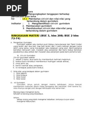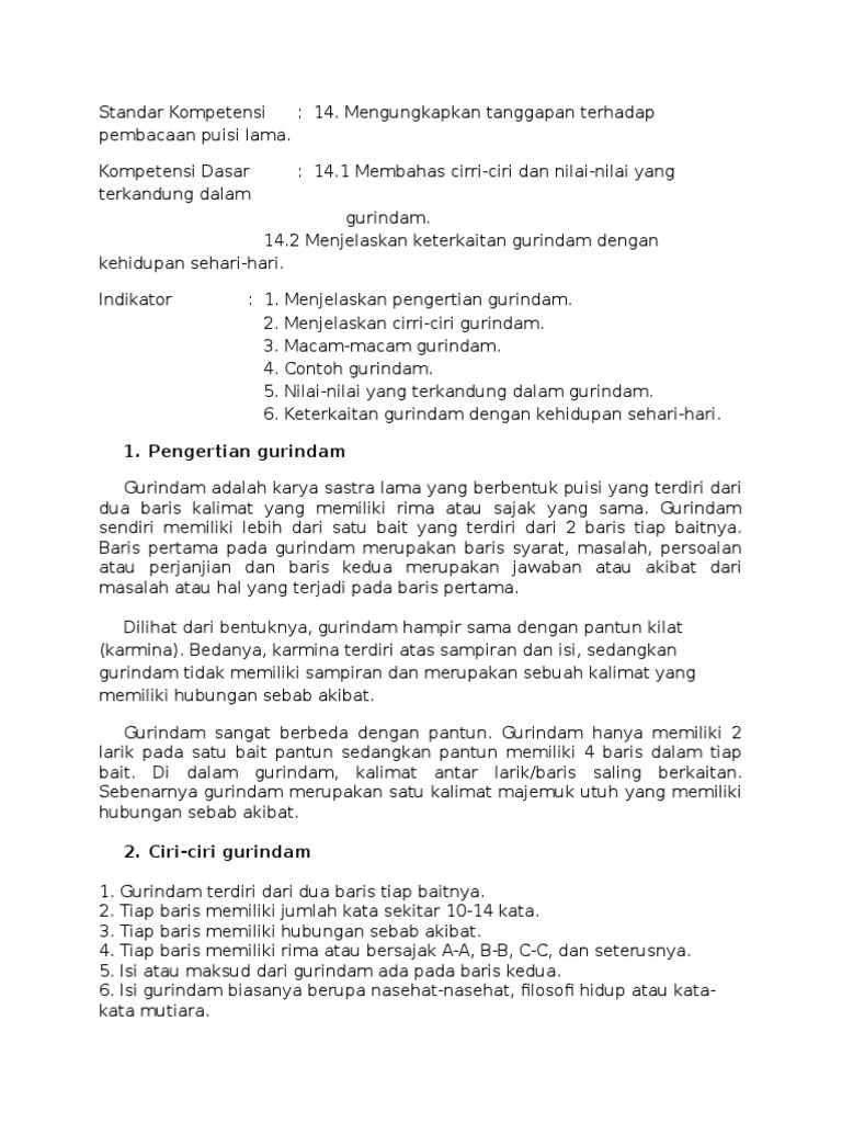 Terkait pemahaman mengenai sastra indonesia, kebanyakan kesusastraan di negara kita berasal dari budaya melayu. Gurindam memiliki dua buah baris pada setiap baitnya. Selain itu jumlah kata per baris hanya sekitar 10 kata saja. Isi kesimpulan atau maksud dari gurindam terdapat pada baris kedua. Maksud atau isi pada gurindam ada di baris kedua. Walau berasal bahasa asing, dalam perkembangan puisi melayu, gurindam berkembang dalam tradisi lisan dan mempunyai bentuknya tersendiri dan berlainan dengan gurindam dalam bahasa sanskrit. Sebagai pelajar, kita harus mengetahui semua itu baik dari pengertian, ciri dan contoh. Gurindam ini dibawa oleh orang hindu atau pengaruh sastra hindu. Gurindam berasal dari bahasa tamil (india) kirindam yang diartikan sebagai perumpamaan. Dalam satu bait terdiri dari dua baris. Berasal dari tamil (india) c. Konon gurindam ini pun berasal dari bahasa tamil atau india. Assalamu'alaikum.wr.wbterima kasih telah mengklik video inivideo ini bertujuan untuk memenuhi tugas ujian akhir semester pada mata kuliah pengembangan media.
